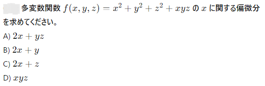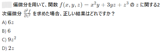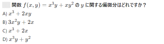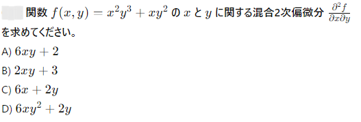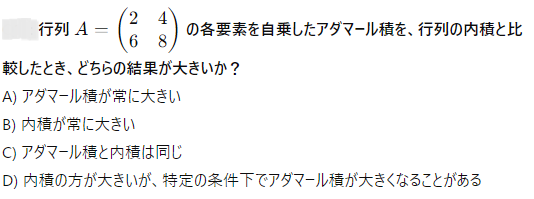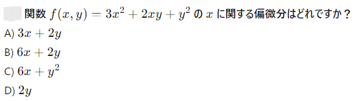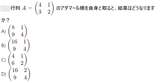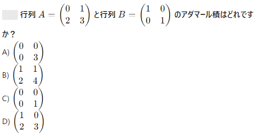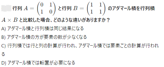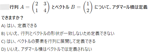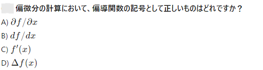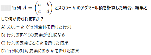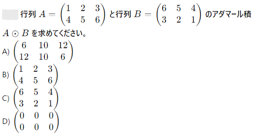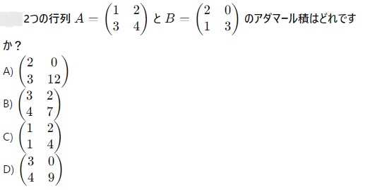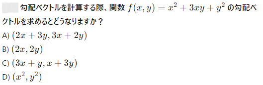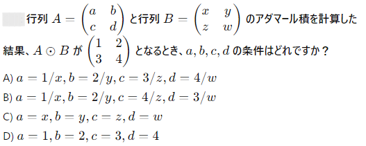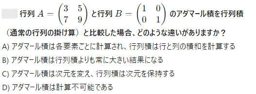 AI実装検定A級~模擬試験⑤~ 2024年12月8日2024年12月8日 ailearn 1. 偏微分を使った最適化において、パラメータ更新の際に利用される代表的な手法はどれですか? ニュートン法 k-最近傍法 勾配降下法 サポートベクターマシン None 2. A B C D None 3. A B C D None 4. A B C D None 5. 条件付き確率が役立つ実世界の例として適切なのは次のうちどれですか? サイコロを振った結果 天気予報が雨になる確率 健康診断での病気の診断結果 宝くじの当選確率 None 6. テンソル積とアダマール積を区別する主な理由は何ですか? テンソル積は行列のサイズを維持し、アダマール積はサイズを変える アダマール積はテンソル積よりも計算量が多い テンソル積はアダマール積の特別なケースである アダマール積は要素ごとに計算し、テンソル積は次元を拡張して計算する None 7. A B C D None 8. A B C D None 9. A B C D None 10. ベイズの定理を用いて、ある商品の購入確率を計算する場合、次のどの情報が最も重要ですか? 購入前の事前確率、購入後の評価、商品の価格 事前確率、購入時の広告効果、購入後の評価 広告効果、商品の価格、購入者のレビュー 事前確率、購入時の広告効果、購入時の価格 None 11. A B C D None 12. ある病気に関する検査の感度が80%、特異度が90%であり、病気の有病率が10%の場合、検査で陰性となった人が実際に病気でない確率を求めなさい。 約95% 約90% 約80% 約85% None 13. A B C D None 14. A B C D None 15. 条件付き確率の定義に基づいて、次の式のうち正しいのはどれですか? P(A∩B)=P(A)+P(B) P(A∩B)=P(A∣B)P(B) P(A∩B)=P(A)−P(B) P(A∩B)=P(A∣B) None 16. A B C D None 17. アダマール積が他の行列積と異なる理由はどれですか? アダマール積は行列のすべての要素を掛け合わせるため、次元が変わる アダマール積は行列の転置を必要とする アダマール積は行列の逆行列を計算する アダマール積は行列の対応する要素同士を掛けるだけであり、次元は変わらない None 18. A B C D None 19. アダマール積はどの分野で主に使用されますか? 統計学のみ ニューラルネットワークや機械学習で使用される 物理学のみ アルゴリズムの最適化にのみ使用される None 20. 偏微分において、他の変数を「固定する」とはどういう意味ですか? 他の変数をゼロにする 他の変数を無視する 他の変数の値を二次微分する 他の変数を定数として扱う None 21. A B C D None 22. アダマール積(Hadamard積)とは、何を示す概念ですか? 行列の内積 行列の外積 行列の行ごとの和 行列の要素ごとの積 None 23. ある商業施設の顧客が購買を行う確率が30%で、購買を行った顧客が再来店する確率が60%の場合、顧客が購買を行い、再来店する確率は次のどれですか? 0.24 0.36 0.18 0.45 None 24. A B C D None 25. A B C D None 26. A B C D None 27. A B C D None 28. ある等比数列の初項が6で、公比が2です。この数列の第8項から第4項までの和を求めなさい。 750 760 770 780 None 29. アダマール積を記号で表すとき、どのような記号が使われますか? ⊗ ⊙ ⊕ × None 30. A B C D None 31. A B C D None 32. ある会社でプロジェクトAが成功する確率が70%、プロジェクトBが成功する確率が50%で、プロジェクトAが成功した場合にプロジェクトBも成功する確率が80%です。このとき、プロジェクトAとBが両方成功する確率はどれですか? 0.35 0.40 0.28 0.56 None 33. 条件付き確率を使って、2つの事象 A と B の同時発生確率を次のように表すことができる: P(A∩B)=P(A∣B)×P(B)。この式に関する次の説明のうち、正しいものはどれですか? 条件付き確率は、片方の事象が発生した後のもう片方の事象の確率を示す 条件付き確率は、2つの事象の和集合を計算するために使用される 条件付き確率は、常に1以下の値を持つ 条件付き確率は、片方の事象が起こらない場合の確率を示す None 34. 行列の和 A+B が定義される条件はどれですか? 行列 A と B は正方行列である 行列 A と B は逆行列を持つ 行列 A と B は同じ次元を持つ 行列 A と B は対角行列である None 35. A B C D None 36. A B C D None 37. A B C D None 38. A B C D None 39. A B C D None 40. A B C D None 41. A B C D None 42. A B C D None 43. A B C D None 44. A B C D None 45. A B C D None 46. A B C D None 47. 条件付き確率を使った例として、次のどの問題が最も適切ですか? サイコロを振るときの確率 交通渋滞が起こる確率 雨が降っているときに交通渋滞が起こる確率 ランダムな数を選ぶ確率 None 48. A B C D None 49. A B C D None 50. 2つの事象 A と B が独立である場合、条件付き確率 P(A∣B) はどのようになりますか? P(A∣B)=P(A) P(A∣B)=P(B) P(A∣B)=P(A∩B) P(A∣B)=1 None 51. A B C D None 52. A B C D None 53. A B C D None 54. A B C D None 55. A B C D None 56. A B C D None 57. A B C D None 58. A B C D None 59. A B C D None 60. A B C D None Time's up