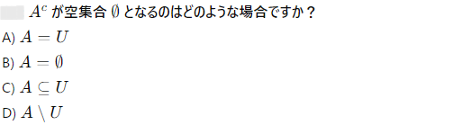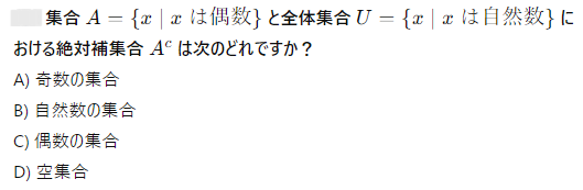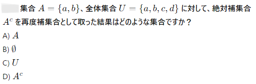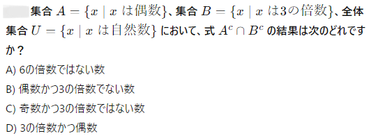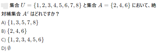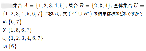 集合 A={1,3,5,7}、集合 B={2,4,5,6}、全体集合 U={1,2,3,4,5,6,7} において、 A∖(A∩B) の結果はどれですか?