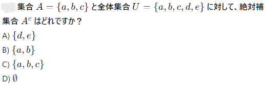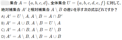 2つの集合 A={a,b,c} と B={b,c,d,e} において、相対補集合 A∖B と B∖A の要素をまとめた集合は次のどれですか?