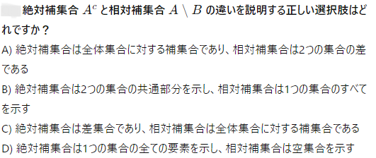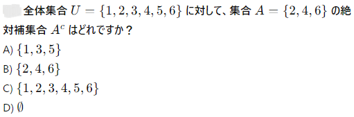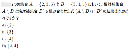 A={1,3,5} と集合 B={2,3,4,5} に対する相対補集合 A∖B は次のうちどれですか?
