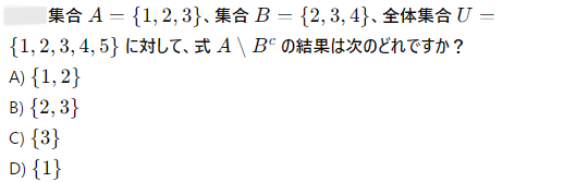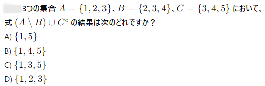3つの集合 A={1,2,3}、 B={2,3,4}、 C={3,4,5} において、式 A∖(B∩C) の結果は次のどれですか?